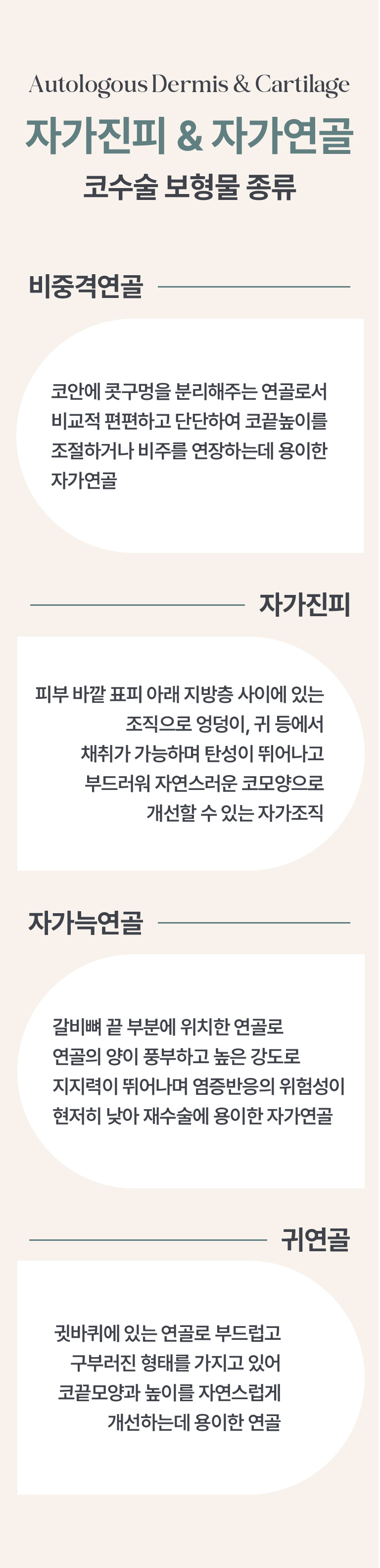 귓바퀴에 있는 연골로 부드럽고 구부러진 형태를 가지고 있어 코끝모양과 높이를 자연스럽게 개선하는데 용이한 연골